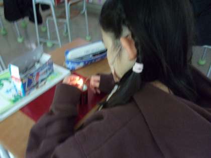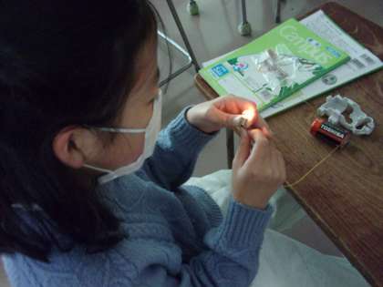 最後は、暗くした教室で、みんなで一斉に明かりをつけてみました。「わあ」歓声が上がります。