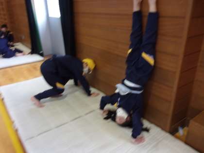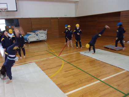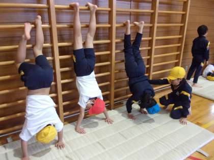 側転、壁倒立、補助倒立からの前転・・・友達と教え合い、励まし合いながら、どんどんチャレンジしています。