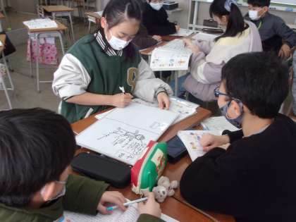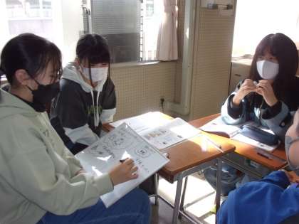 家庭科の学習をしています。グループで考えを出し合っています。仲のよさが伝わってきます。