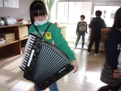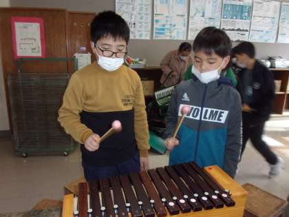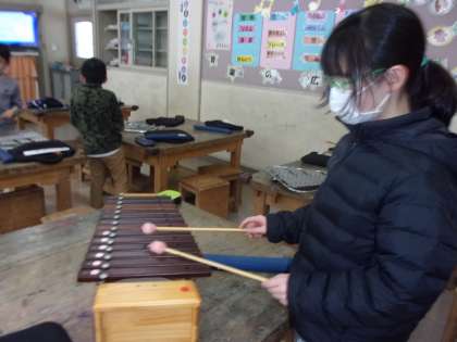 音楽科の学習です。いろいろな楽器に触れ、興味津々。音楽が大好きなのですね!