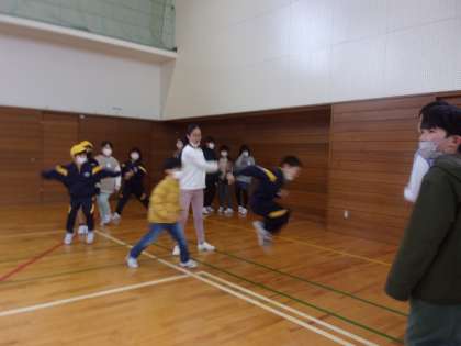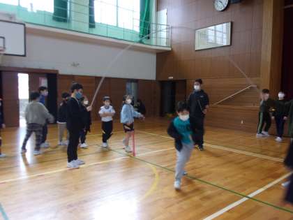 上学年の子供が下学年の子供と一緒に縄に入ったり、背中を優しくタッチしてタイミングを教えたりしています。縦割り活動の良さを感じます。