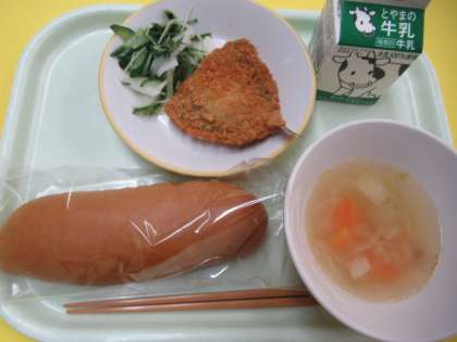 9日(木)今日の献立 公開日 2023/02/09 更新日 2023/02/09 給食室 ・黒糖コッペパン ・牛乳 ・あじフライ ・かぶのサラダ ・マカロニスープ ※11時45分、検食終了。異常ありません。 スープには、いろいろな形のマカロニが入っています。 何の形でしょう? アルファベット? 数字? それとも・・・