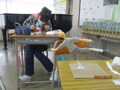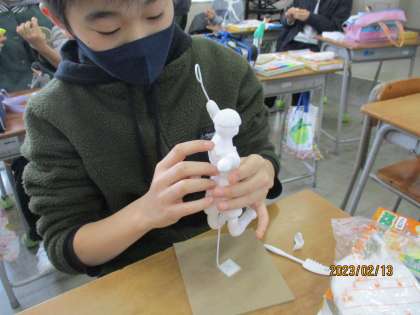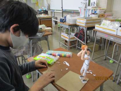 図工の時間に「未来の自分」を作っています。粘土で作るのが難しくて、乾くとヒビが入ってしまいます。僕は、体をつくり終わったので、あとは色を塗るだけです。頑張ります。
