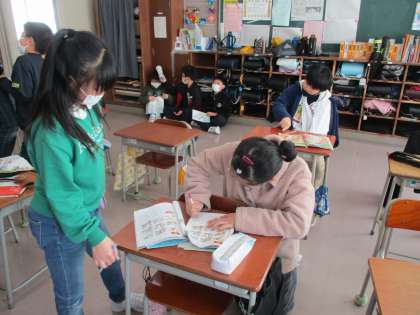 外国語活動で友達の好きな場所について、お互いに質問し合いました。習った英語を使って学習に取り組みました。