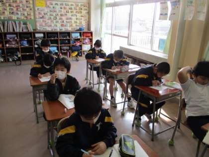 2年生の学習の復習をしています。来年度、気持ちよくスタートが切れるように、かけ算等、ご家庭でも復習をしてください。