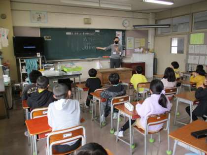 今日は、ジェフ先生に来ていただき外国語の学習をしました。様々な色を英語で言う練習をしました。来年度から外国語活動の学習が始まります。がんばってね。