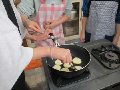昨日、調理実習をしました。プチホットケーキをつくりました。うまくできてよかったです。班のみんなと協力してできました。