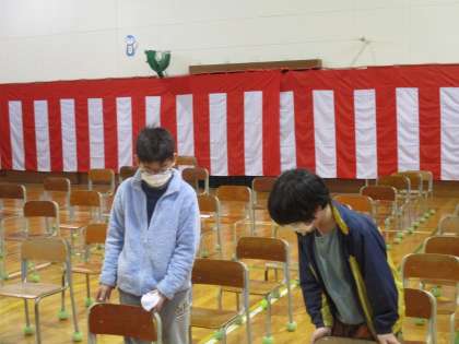 4・5年生 卒業式の準備 公開日 2023/03/17 更新日 2023/03/17 4年生 明日は、いよいよ卒業式です。4年生も学校の一員として、5年生と一緒に卒業式の準備に取り組みました。6年生が気持ちよく式をむかえられるように隅々まで掃除をしたり、いすを並べたりしました。