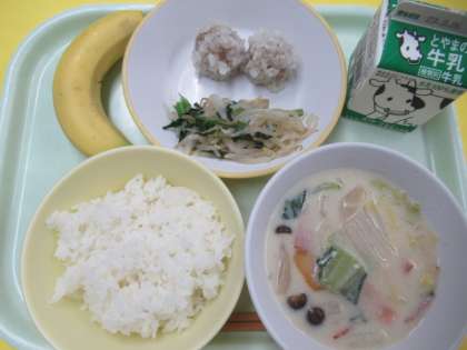 20日(月)今日の献立 公開日 2023/03/20 更新日 2023/03/20 給食室 ・ごはん ・牛乳 ・もやしとにらのソテー ・珍珠丸子 ・白菜の中華クリーム煮 ・バナナ ※11時50分、検食終了。異常ありません。 今日は、中華風の献立です。 デザート付きなのも、うれしいですね。