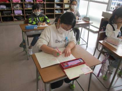 鉛筆の持ち方や姿勢に気をつけながら字を書いています。