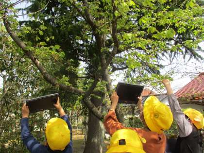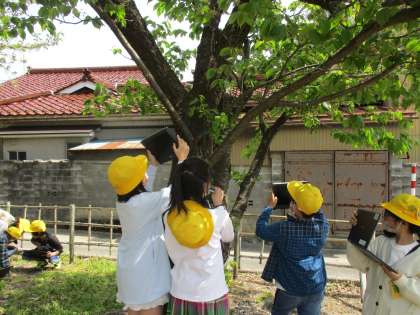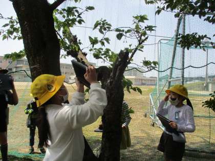 花びらが散って、葉が出てきました。 触ったり、近くで見たりしながら、葉や花の様子を観察しました。