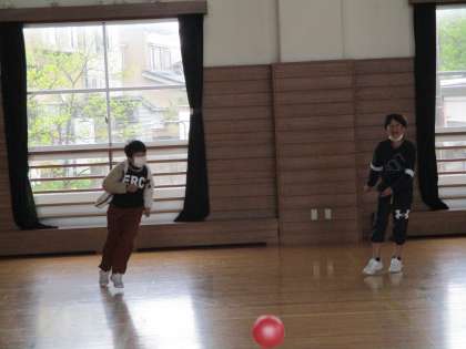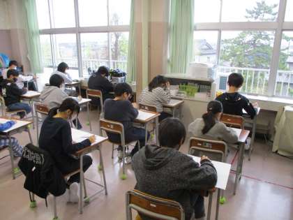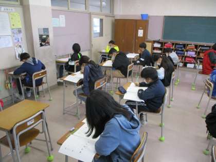 学力調査に真剣に取り組んでいます。 テストが終わり、昼には元気に体育館で体を動かしました。
