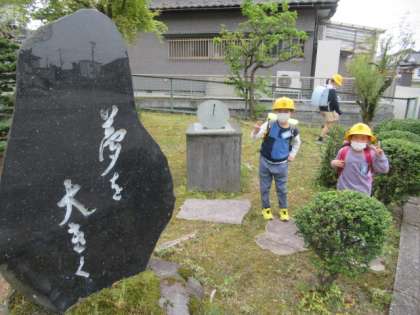 穏やかな朝です。 前庭で、児童玄関が開くのをまっています・・・