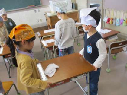 床拭きも机運びもがんばりました。教室のほこりがたくさんとれて、きれいになりました。