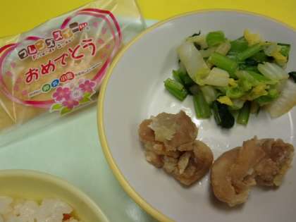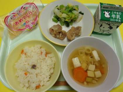 18日(火)今日の献立 公開日 2023/04/18 更新日 2023/04/18 給食室 ・ちらし寿司 ・牛乳 ・鶏肉のから揚げ ・おひたし ・すまし汁 ・お祝いデザート ※11時45分、検食終了。異常ありません。 今日は、「1年生の入学お祝い献立」です。 デザート(いちごクレープ)付きなのが、うれしいですね。