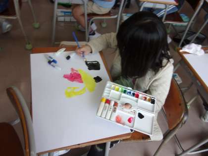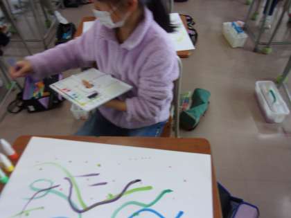 今日は、絵の具の使い方を再確認してから、自分でオリジナルの色をつくり、様々な線を描いたり形を描いたりしました。