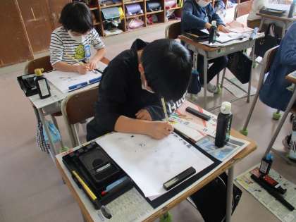 筆を使って、のびのびと字をかいています。 楽しそうです・・・