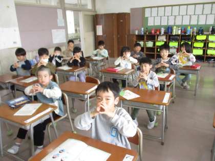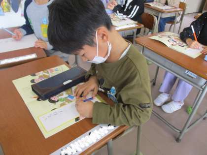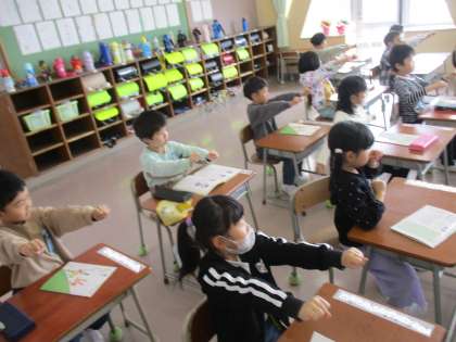 まずは、「書写体操」で体や指をほぐします。その後は、鉛筆の持ち方や姿勢に気を付けて、丁寧に書きました。
