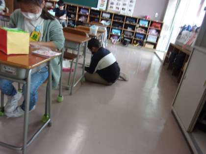 図工の時間に教室が絵の具で汚れてしましました。すると、自分の席の周りでなくても、進んで掃除をしていました。ステキな行動ですね。