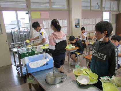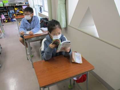 給食の後片付けも静かに行っていました。食後に「すき間読書」に取り組む姿もあります。ステキです。