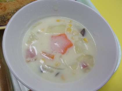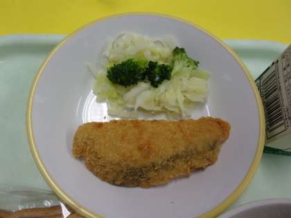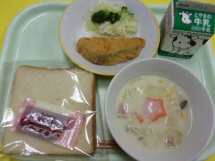 27日(木)今日の献立 公開日 2023/04/27 更新日 2023/04/27 給食室 ・食パン ・メープルジャム ・牛乳 ・サーモンフライ ・ブロッコリーサラダ ・クリームチャウダー ※11時45分、検食終了。異常ありません。 今日は、「サミット給食〜カナダ〜」です。 調理員さんの一手間で「星」などの形をした野菜が入っています。 見つけられるかな?