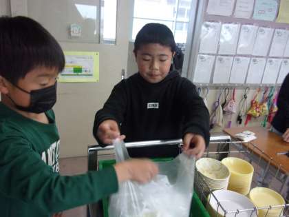 給食のおぼんやお皿などをきれいに整頓したり、