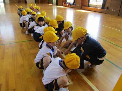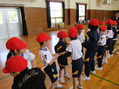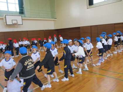 どの団のかけ声が元気がよいかな?今日は、「声の綱引き」をしてみました。