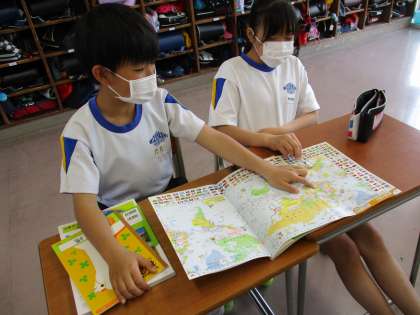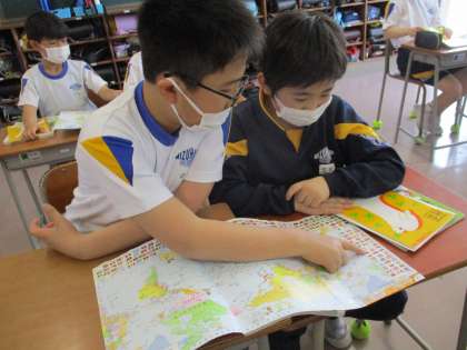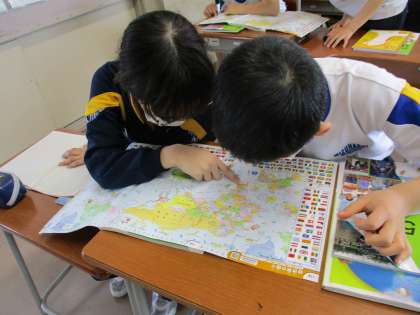 社会科の時間。最初の3分間、地図帳を使って「世界の国々の位置」をみんなで楽しく確認しています。熱心に取り組む子供たちです。