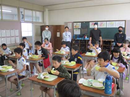 給食中、ホタルイカ出前講座の方々が子供たちの様子を見にこられました。おいしくホタルイカをいただく子供たち。少しの時間ですが、質問にも答えてくださいました。ありがとうございました。