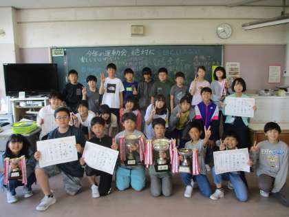 運動会、頑張りました! 教室に書いた意気込みの前で記念撮影です。