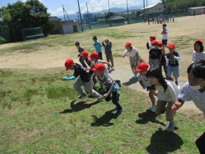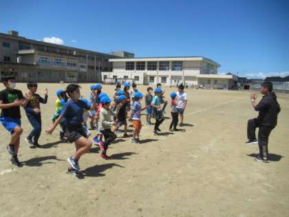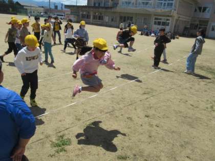 はじめてのグラウンドでの活動です。7秒間走、ゴム跳び、スキー山ダッシュ・・・楽しみながら取り組みました。
