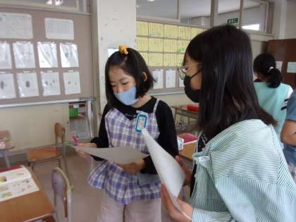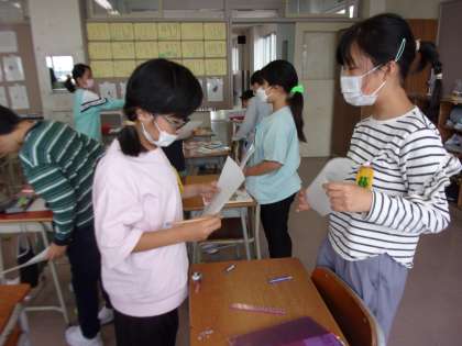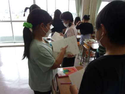 友達とワークシートに書いたことを紹介し合っています。友達と交流することで、新たな発見をしたり、気付きが生まれたりするようです。