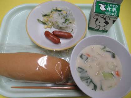 6月1日(木)今日の献立 公開日 2023/06/01 更新日 2023/06/01 給食室 ・コッペパン ・牛乳 ・あらびきウインナー ・水菜のサラダ ・クリーム煮 ※11時40分、検食終了。異常ありません。 毎週木曜日は、パン食の日です。
