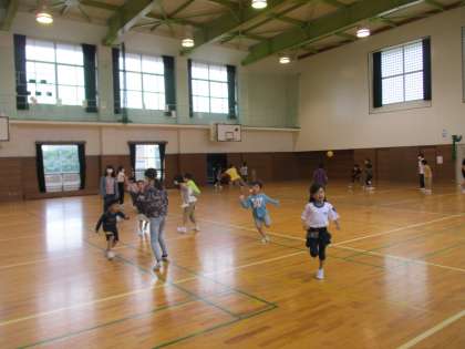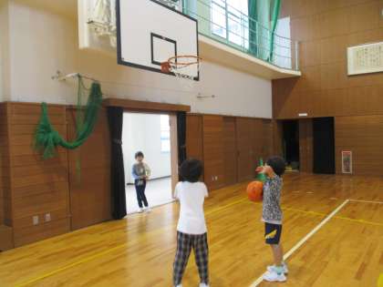 鬼ごっこ、シュート・・・体育館で、元気よく体を動かす子供たちです。