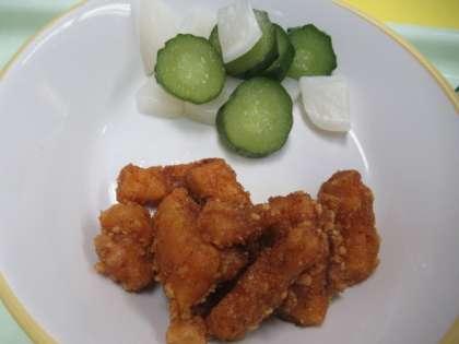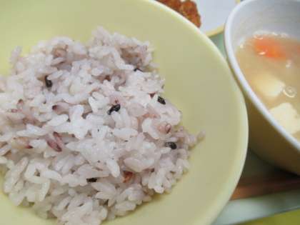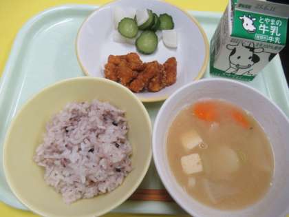 5日(月)今日の献立 公開日 2023/06/05 更新日 2023/06/05 給食室 ・雑穀入りごはん ・牛乳 ・すいとん ・いかのかりん揚げ ・2色ピクルス ※11時45分、検食終了。異常ありません。 ご飯は「赤飯」のようにも見えますが、「雑穀入りごはん」です。 「いかのかりん揚げ」は、ほんのりカレー味がついています。 みそ汁の中に「すいとん」(小麦粉の平たい団子)が入っています。