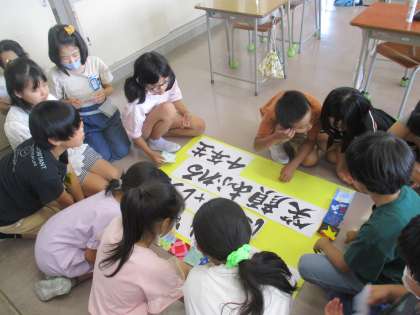 学級目標に飾りをつけました。できあがったものをうれしそうに眺めていました。