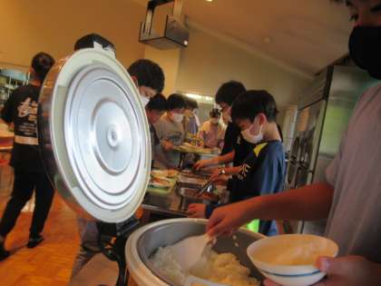 元気いっぱいに所内の活動を行った子供たち。楽しみにしていた夕食の時間です。もりもり食べて次の活動に備える子供たち。食堂から提供されたものを、なんと!全員で完食しました!