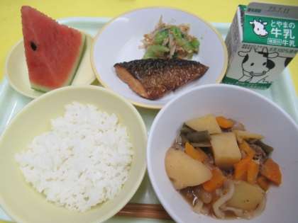 4日(火)今日の献立 公開日 2023/07/04 更新日 2023/07/04 給食室 ・ごはん ・牛乳 ・肉じゃが ・さばの塩焼き ・あぶり大豆和え ・すいか ※11時45分、検食終了。異常ありません。 夏らしい?デザート付きなのも、うれしいですね。