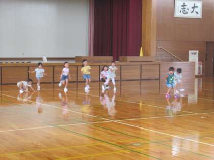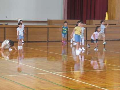 ワックスがけが終了し、ピカピカになった体育館で、健全育成の子供たちが楽しそうに「だるまさんが こーろんだ」をしていました(8日)。