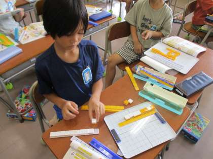 数をブロックで表しています。10のまとまりをつかうと、分かりやすいですね。