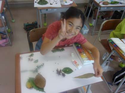 「み近なしぜんの形・色」では、葉っぱを使って絵を描きました。
