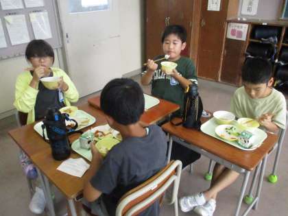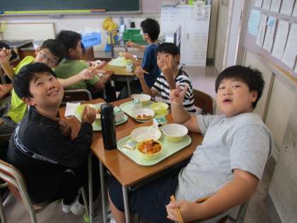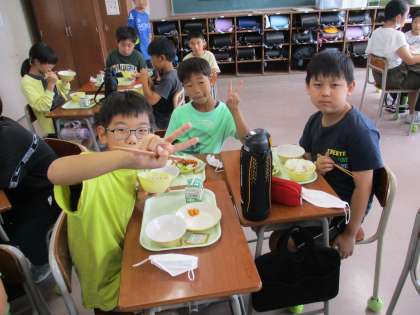 おいしいものを食べると笑顔になりますね〜。おいしい給食に感謝です。