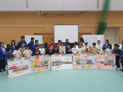 新しい学校の設計の途中で「初めて」開かれたWS。子供たちから出された希望やアイディアは、設計の方々(青い服の方々)が、可能な限り設計図に盛り込んで行くそうです。