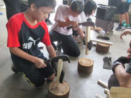 「なた」で太い薪を割り、細い薪づくり。