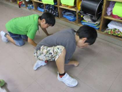 床に付いた鉛筆の汚れを消しています。進んで働く姿、花丸です!