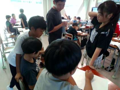 自分の考えをペアで交流しています。