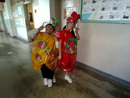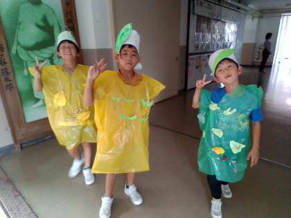 学習発表会の練習のために体育館へ向かう、たくさんの野菜たちに出会いました。
