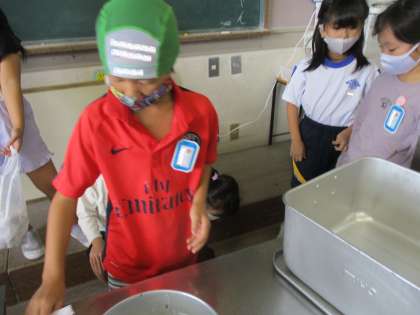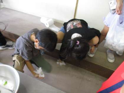 スープがこぼれてしまいました。ペーパーを持って、さっと片付けを手伝う子供たち。なかよし花丸です!