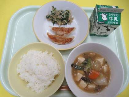 6日(金)今日の献立 公開日 2023/10/06 更新日 2023/10/06 給食室 ・ごはん ・牛乳 ・焼きぎょうざ ・ナムル ・えびと豆腐のうま煮 ※11時40分、検食終了。異常ありません。 今日は、中華風の献立です。