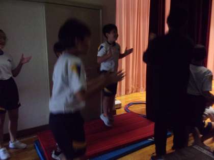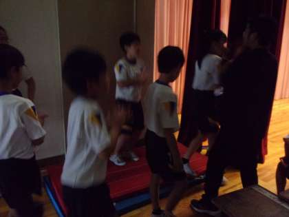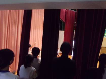 会場からは見えない舞台裏。子供たちは、ノリノリでダンスをしたり、手拍子をしたりと大盛り上がり。仲間の演技を楽しむ態度、仲間の演技をともに盛り上げようとする態度がステキでした。